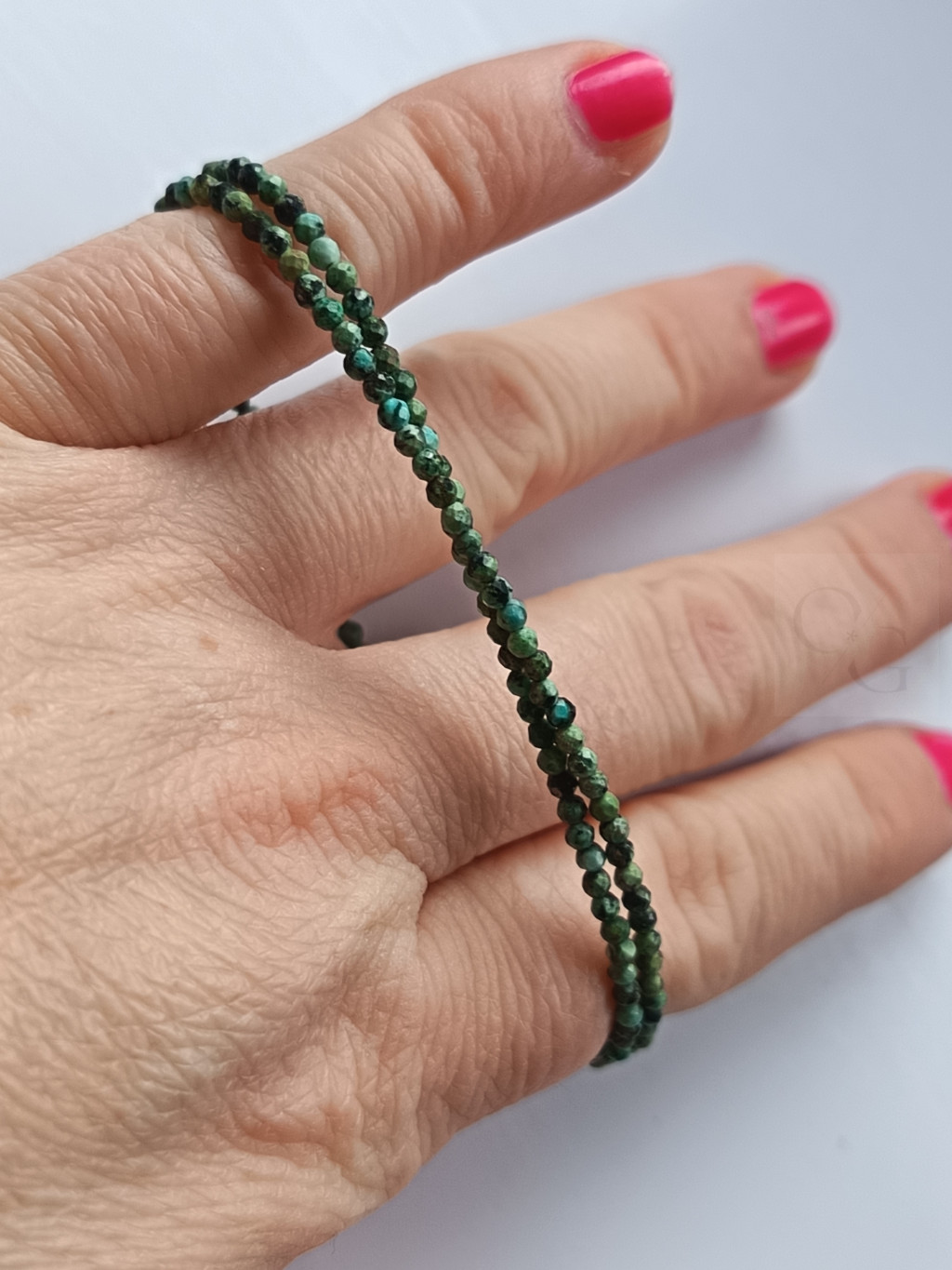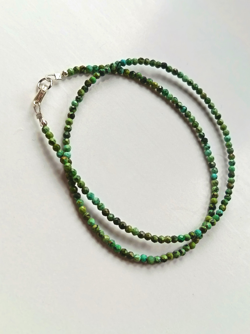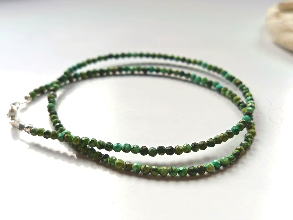Ez a kiváló minőségű, duplasoros ezüst karkötő az afrikai türkiz ásványok természetes szépségét és ragyogását ötvözi. Az ékszer 2-3 mm átmérőjű, fazettált afrikai türkiz ásványokból készült, melyek különleges mintázata és élénk kék árnyalatai minden viselőjét lenyűgözik. A fazettált vágás mélyítést és csillogást kölcsönöz az ásványoknak, kiemelve azok egyedi szépségét.