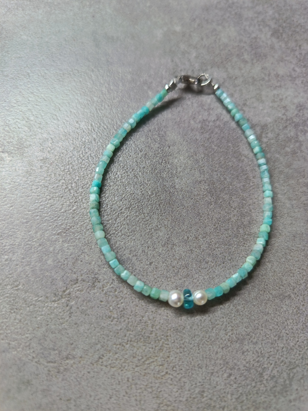 Amazonit karkötő apró tenyésztett gyönggyel és apatittal – ezüst szerelékkel