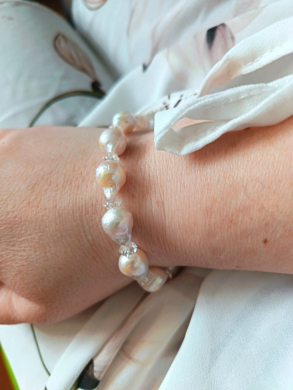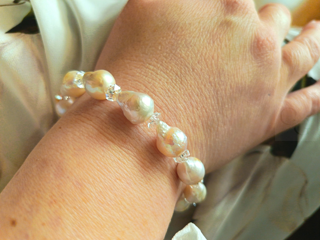Ez a lenyűgöző karkötő a klasszikus elegancia és a természetes szépség tökéletes találkozása. A finom, szabálytalan alakú barokk tenyésztett gyöngyök gazdag textúrát és egyedi karaktert kölcsönöznek a darabnak, miközben a hegyikristály különleges ragyogással és energiával töltik meg a viseletet.