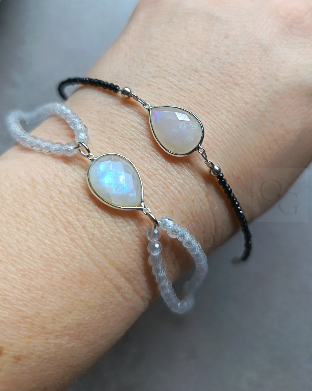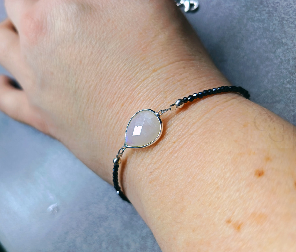 Ez az ünnepélyes, klasszikus stílusú ezüst karkötő elegáns megjelenést kölcsönöz viselőjének. A központban egy nagy, gyönyörű holdkő medál található, amely varázslatosan játszik a fényben, és kiemelkedő fókuszpontként szolgál. A medál körül fekete cirkónia kövek díszítik, melyek kifinomult kontrasztot adnak az ezüst színhez, és prémium megjelenést biztosítanak az ékszernek.