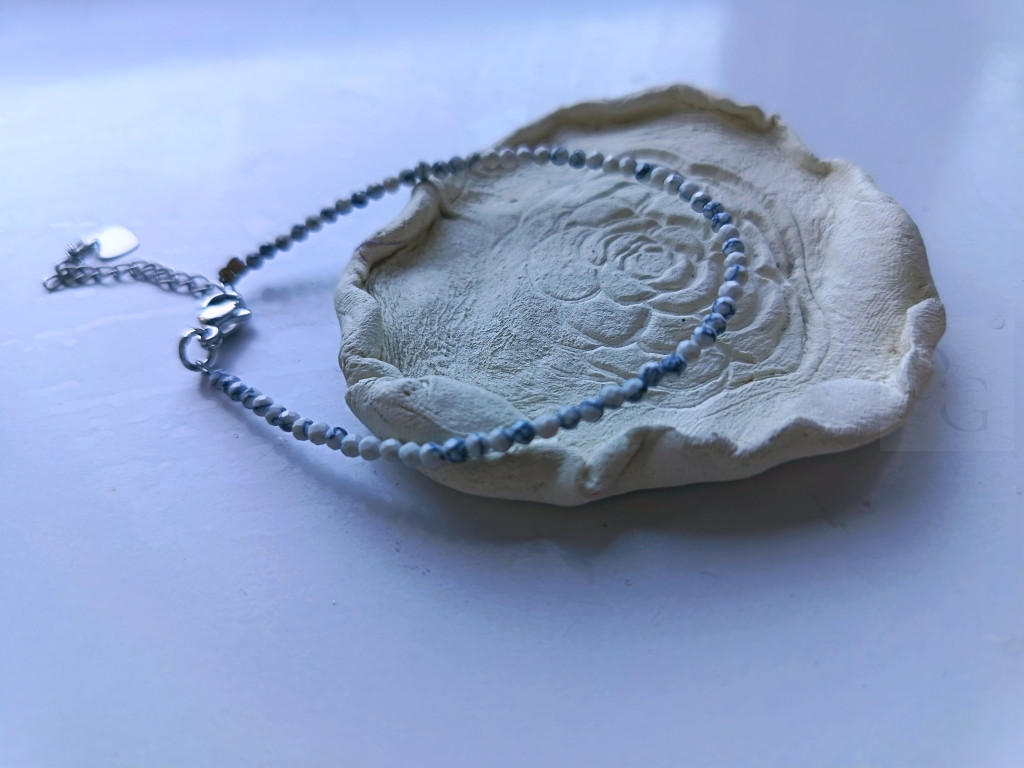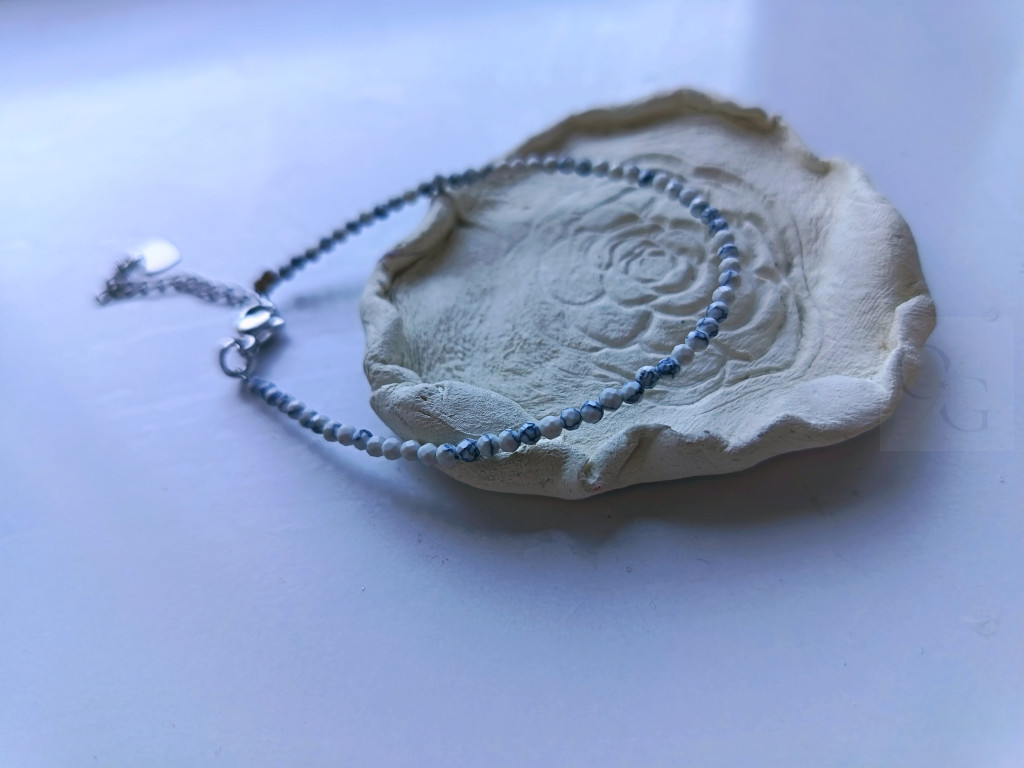 Ez a gyönyörűen kialakított állítható karkötő howlittel készült, egyenletes méretű howlit gyöngyökkel, amelyek tökéletesen illeszkednek a csuklódhoz és kényelmes viseletet biztosítanak. A 2,5 mm-es gyöngyök simák és fényesek, jellegzetes fehér színükkel és finom szürke erezetükkel mutatósak.