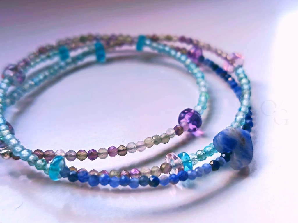 A három soros, 51 cm hosszú karkötő szodalitból, levendula ametisztből