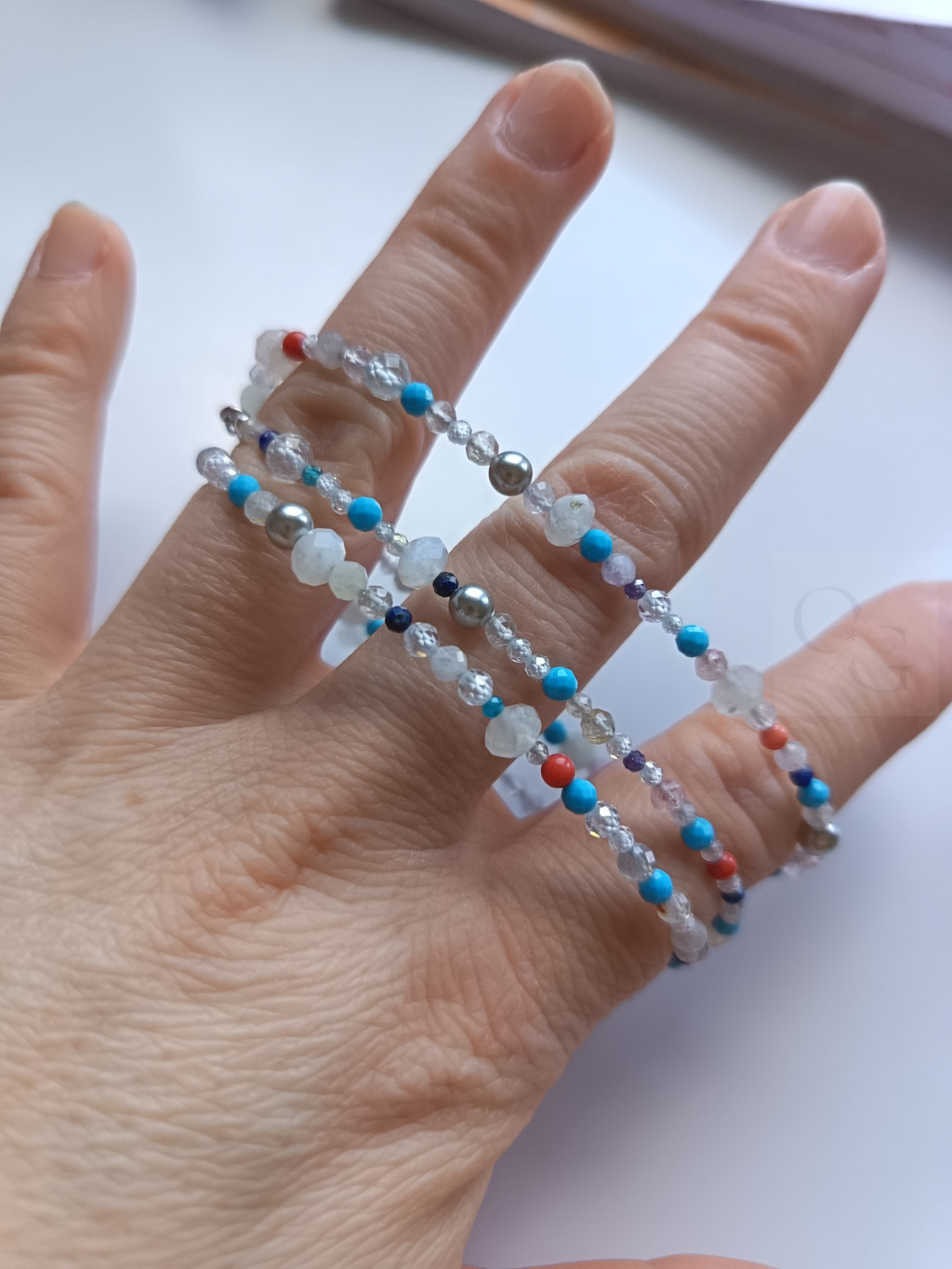 világos jade, kagylógyöngy, korall, türkénit, ezüst, nyári energia,