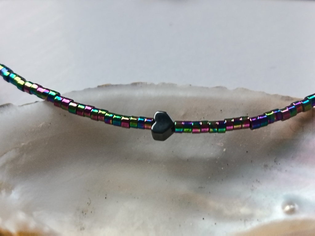 A legfeltűnőbb és legkiemelkedőbb díszítőelem a középen elhelyezett hematit szív. Ez a szív nemcsak esztétikai értékével ragadja meg a tekintetet, hanem szimbolikus jelentésével is. A hematit szív a szeretet, az érzelmek, az összetartozás és az önértékelés szimbóluma. A szív formája finoman ívelt, az ékszer központi része pedig enyhén kidomborodik, így még hangsúlyosabbá téve a szív alakját. A hematit kő sajátos, fémes csillogása és mély, sötétszürke árnyalata tökéletesen kiemeli a szív formáját, miközben egyedi, természetes fényt kölcsönöz az ékszernek.