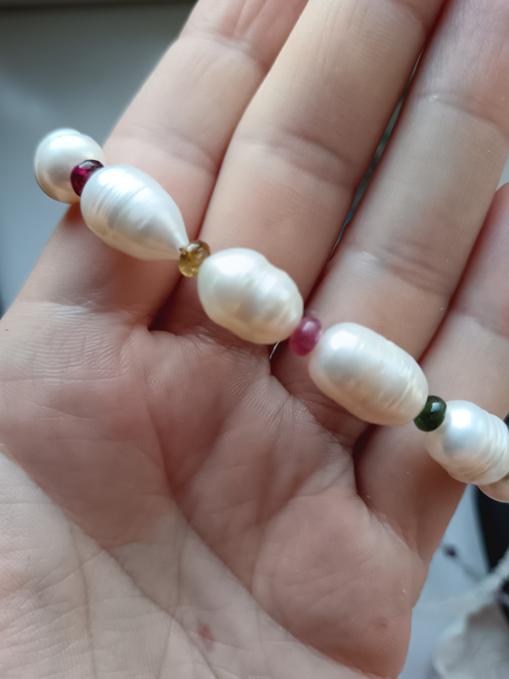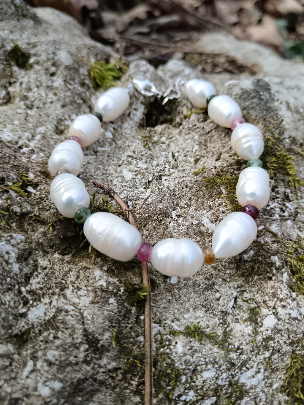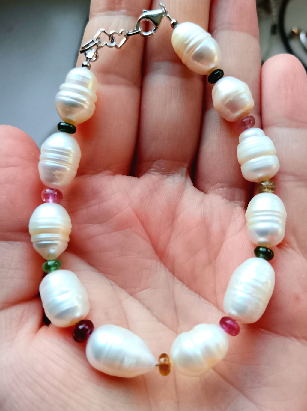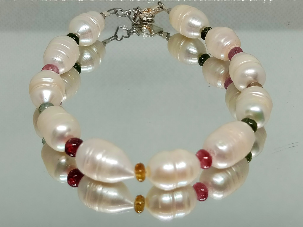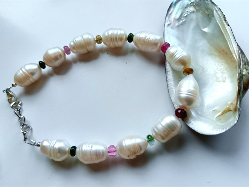 A tenyésztett gyöngyök, mint a holdfény csillogása, finoman ölelik körbe a turmalin gyönyörű, szinte áttetsző színeit.