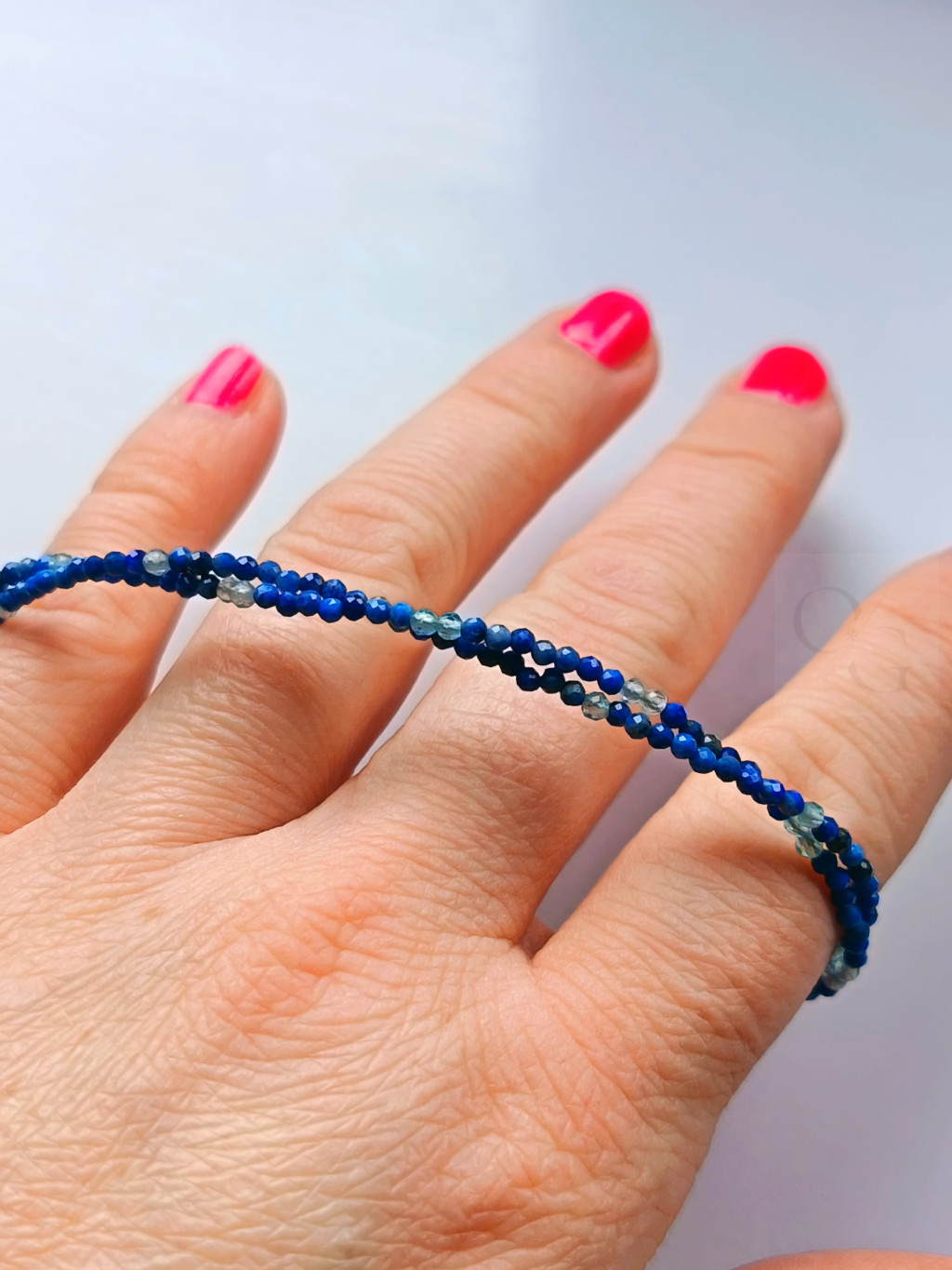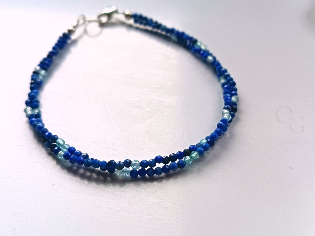 A karkötőben található lápisz lazuli és apatit kövek harmonikusan ötvözik egymást. A lápisz lazuli mélykék színével és gazdag arany csillogásával igazi luxus érzetet kelt, a kövek mély nyugalmat és belső békét sugároznak. Az apatit kékeslila árnyalata frissességet és energiát hoz a viselésébe, segít a koncentrációban és a lelki egyensúly megtalálásában.