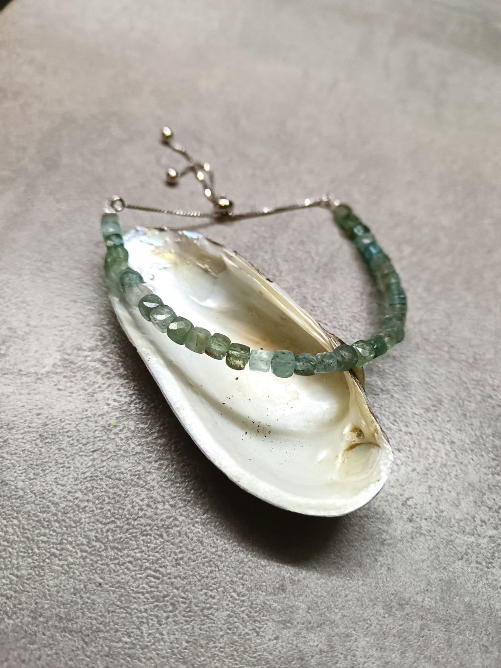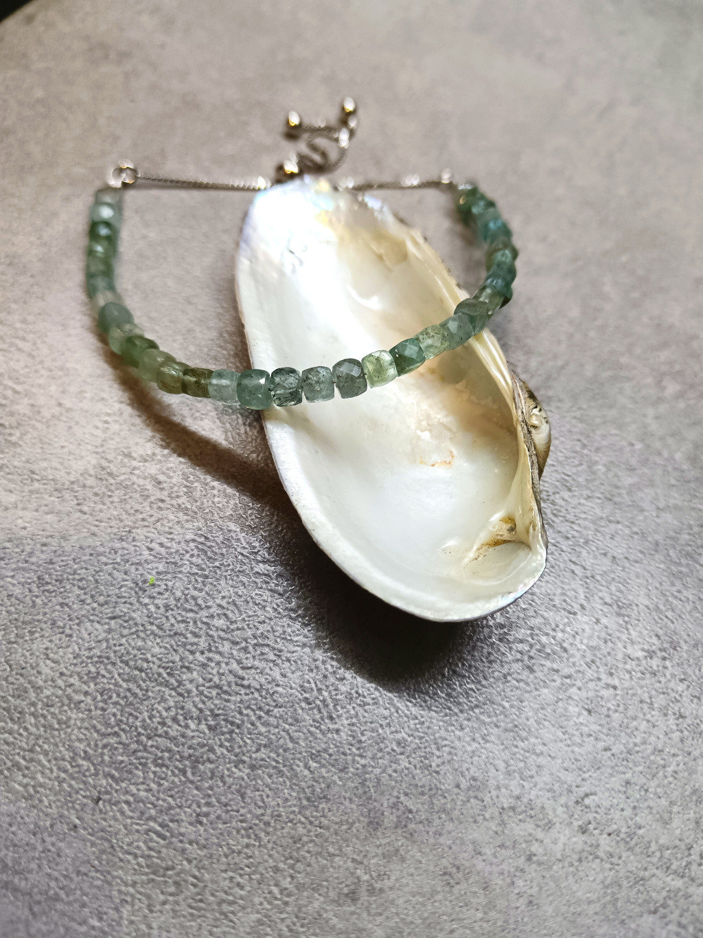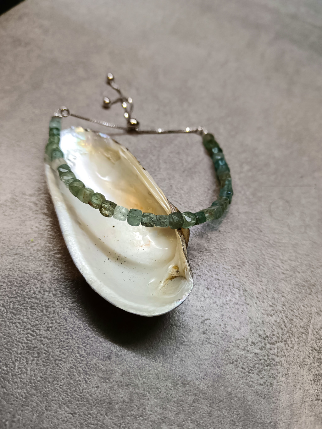 Ez az apatit karkötő egyedülálló darab, mely természetes, zöldes árnyalatú kockaszemekből áll. Az apatit kristályok mély, nyugtató zöld színével és finom áttetszőségével nyugalmat és harmóniát sugároz. A kocka alakú szemek elegánsak és modern megjelenést kölcsönöznek a karkötőnek, miközben a természetes szépséget hangsúlyozzák.