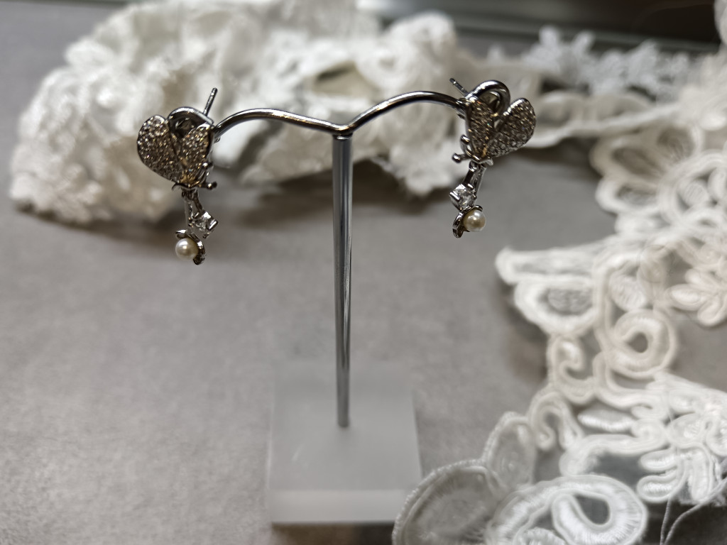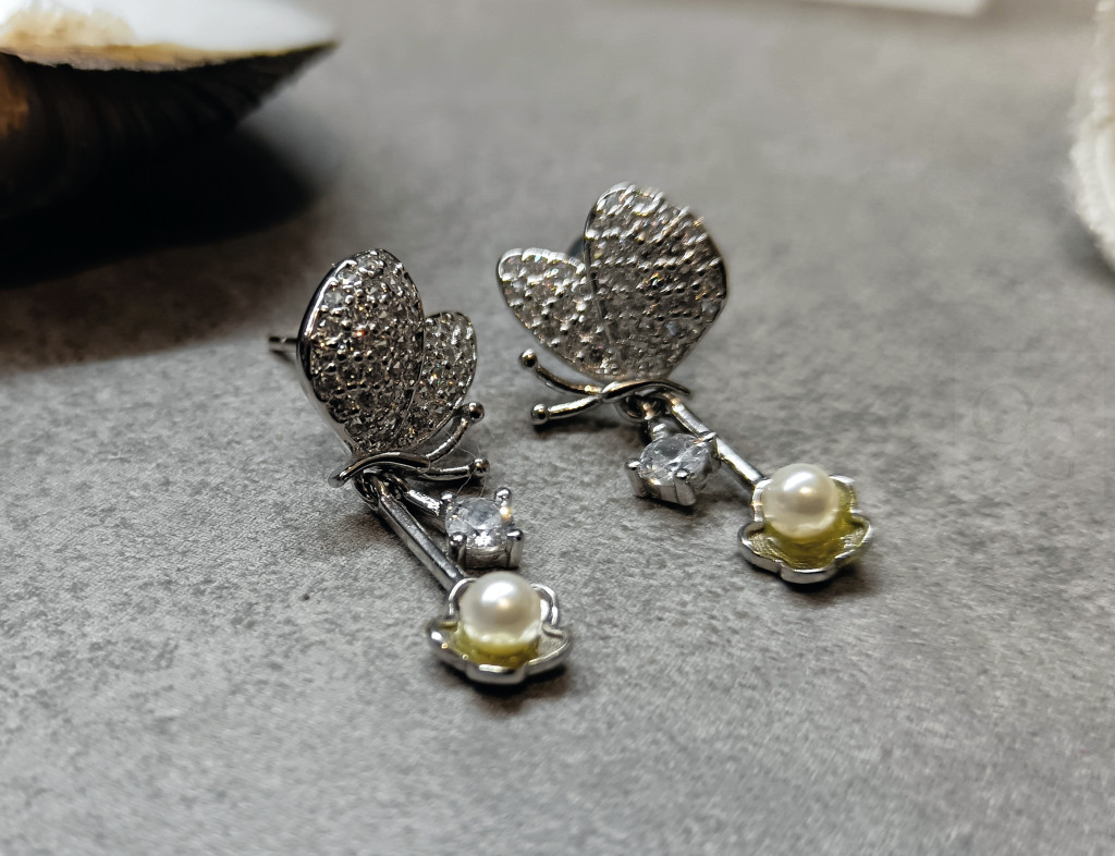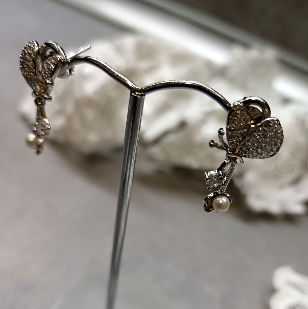 Ez a csodálatos, különleges ezüst fülbevaló igazi kis ékszerdoboz a gyönyörűség és az egyediség szerelmeseinek. A finom ezüst alapot egy bájos pillangó formájú díszítés koronázza meg, amelyet ragyogó cirkóniák díszítenek, így minden mozdulatnál csillogva ragyog. A fülbevaló bedugós kialakításának köszönhetően kényelmes viseletet nyújt, mindemellett egy apró gyöngy is díszíti a design-t, ami még különlegesebbé teszi ezt az egyedi darabot.