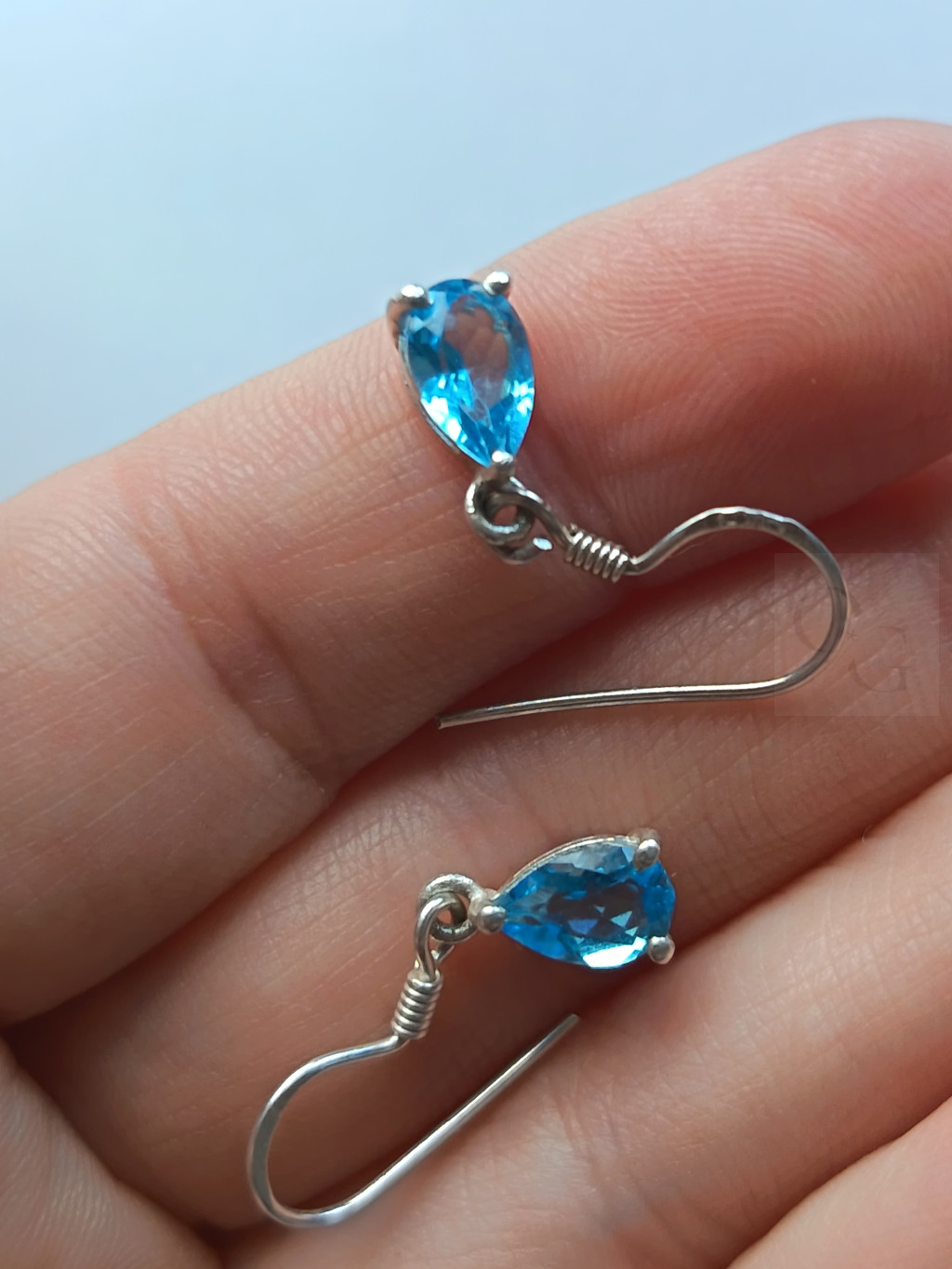 **Kék topáz fülbevaló – Ezüst foglalatban, csepp alakú, élénk színű**