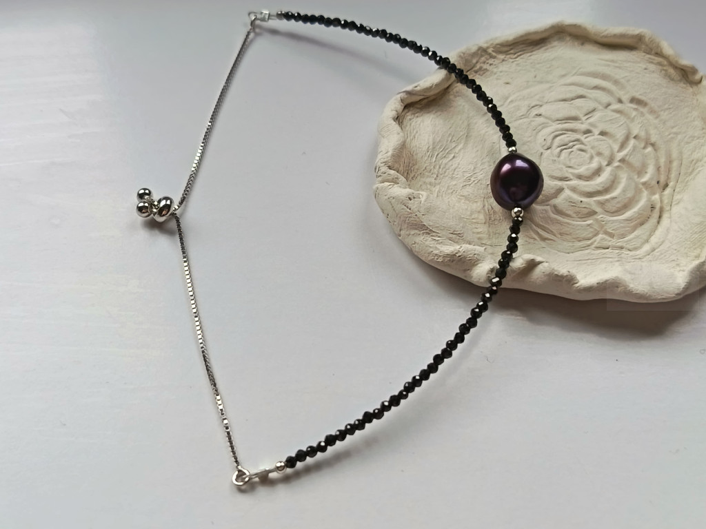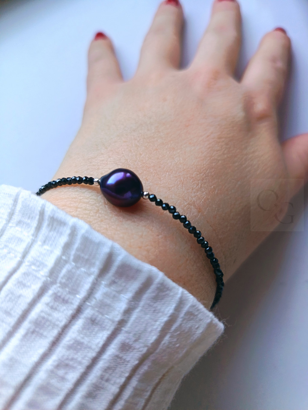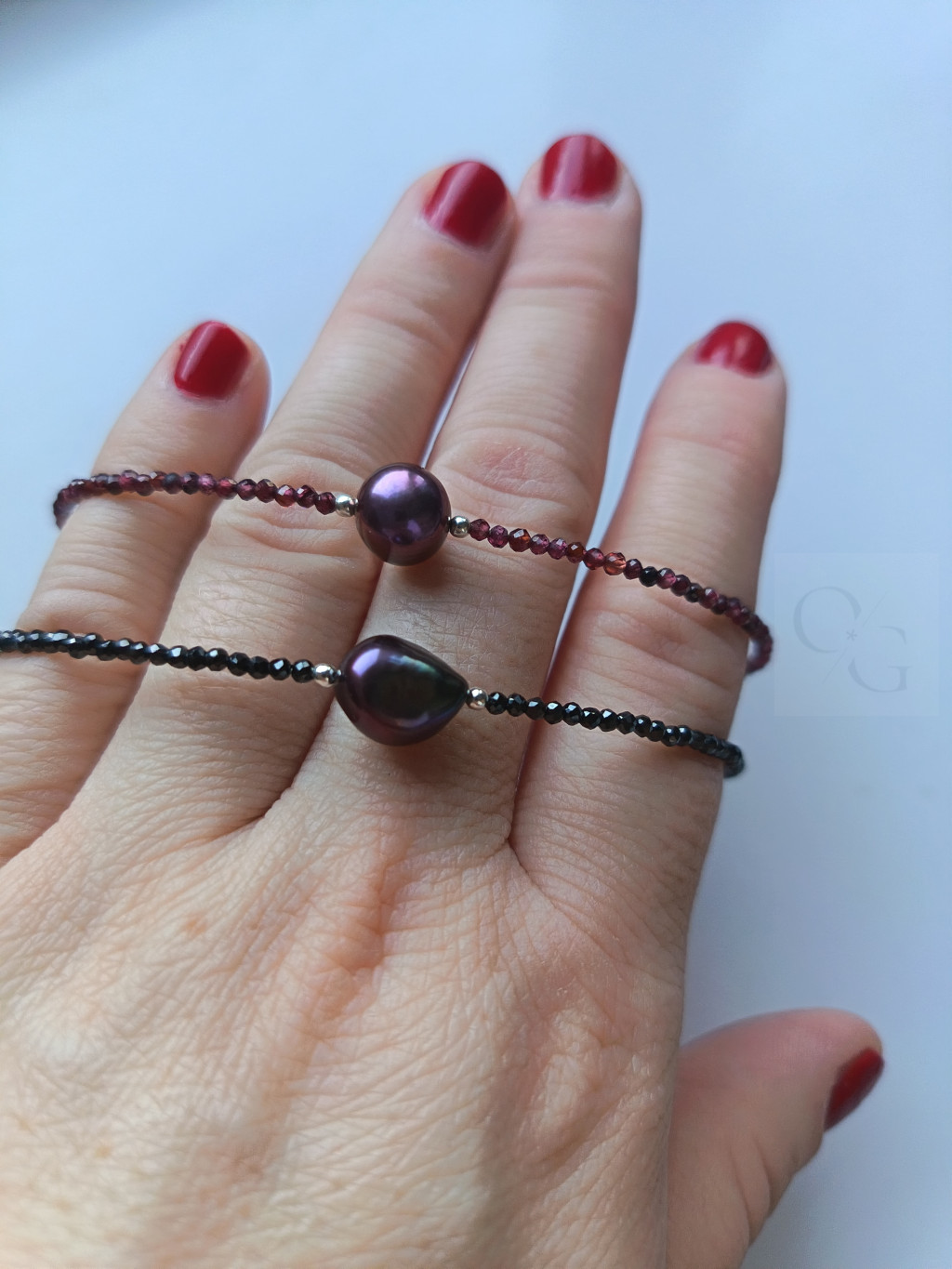 A karkötőt apró szemű gránát drágakövek díszítik, mély vörös színükkel és energikus megjelenésükkel, melyek a luxus és a szenvedély szimbólumai. A központi elemet egy elegáns, sötét lilás árnyalatú igazgyöngy alkotja, mely a finom luxus és az időtlen elegancia megtestesítője. Ezt a különleges kombinációt most fekete cirkónia kő díszíti, amely ragyogó, fekete fényével és a tökéletesség illúziójával hangsúlyozza a karkötő exkluzív jellegét.