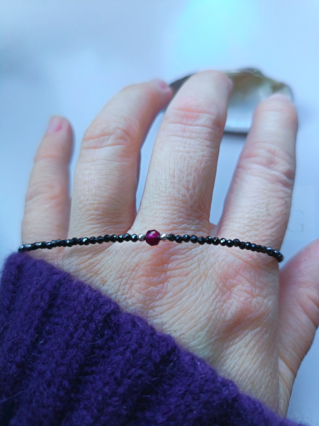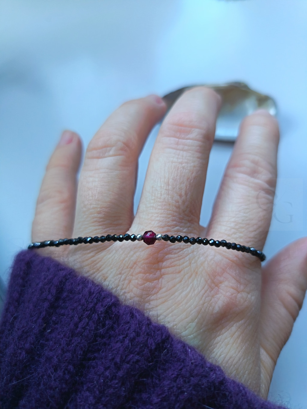 A karkötő középpontjában lencse alakú, mélybordó gránát kapott helyet, amelyet ezüst gyöngyök fognak közre, különleges fókuszt teremtve. A gránát gazdag színe szenvedélyt, erőt és kifinomultságot sugároz, valódi ékköve ennek a csodaszép darabnak.