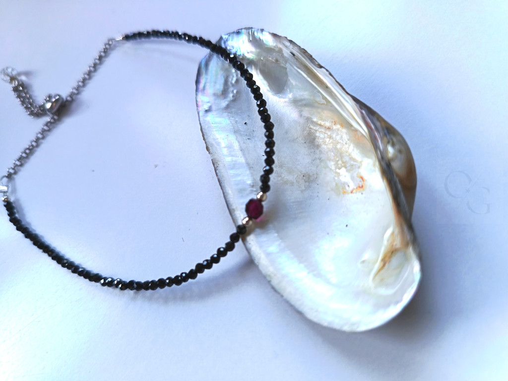 Ez a fekete cirkon és gránát karkötő valódi különlegesség, amely a szenvedélyes színek és a letisztult luxus tökéletes találkozása