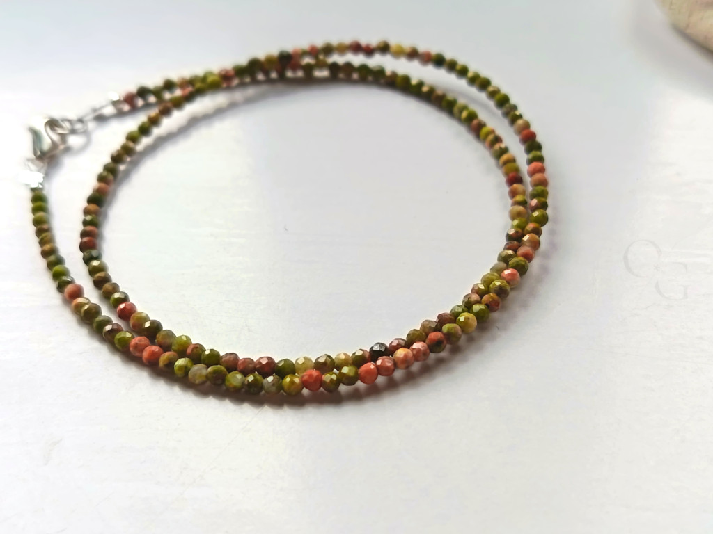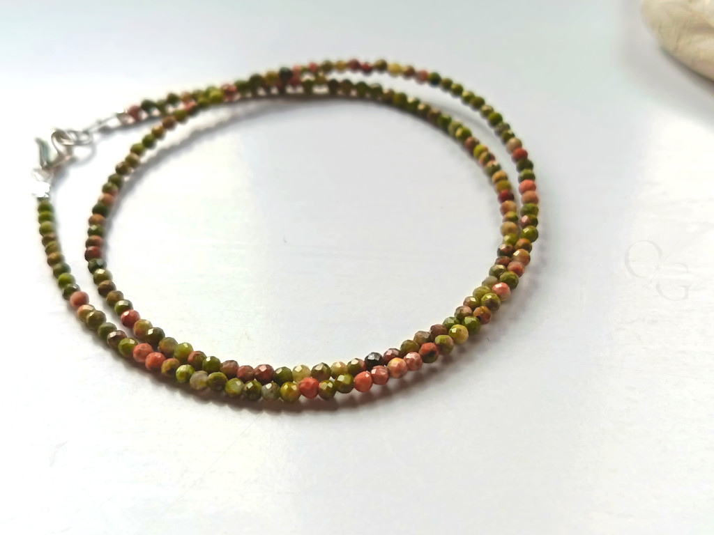 Ez a lenyűgöző duplasoros karkötő kiváló minőségű, fazettált unakit ásványból készült, melynek mérete 2 mm. A fazettált vágásnak köszönhetően az ásvány ragyogó csillogást és mélységet kap, kiemelve természetes színátmeneteit és finom mintázatát. A karkötő hossza 35 cm, így ideálisan illeszkedik a csuklóra, kényelmes viseletet biztosítva mindennapokra vagy különleges alkalmakra egyaránt.